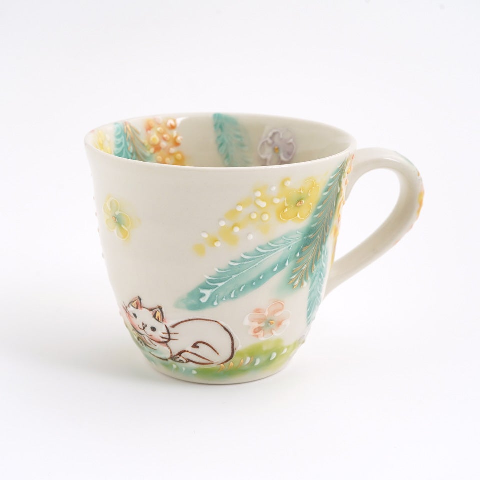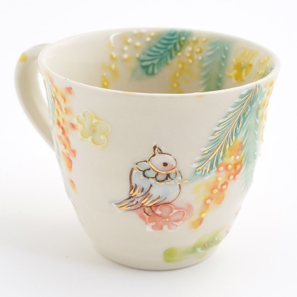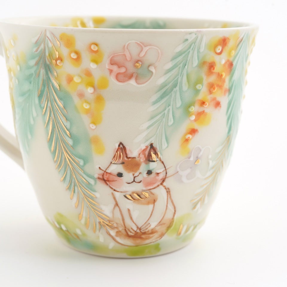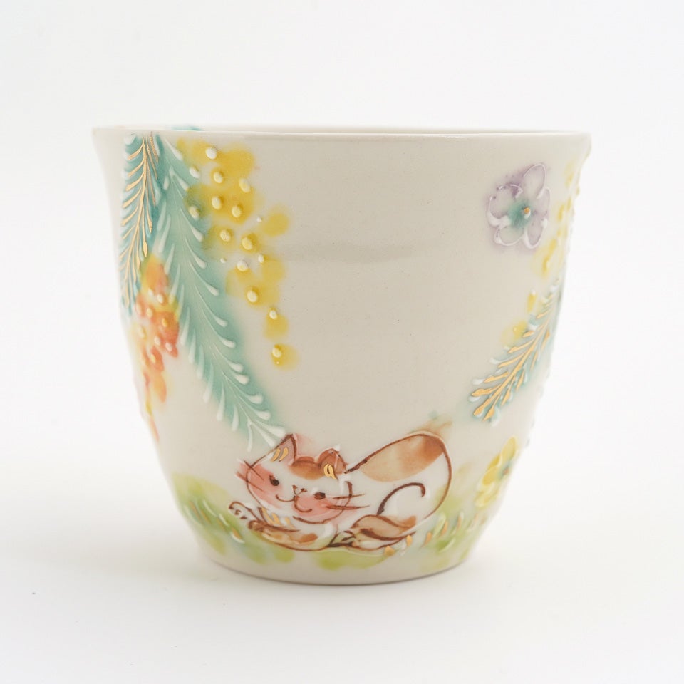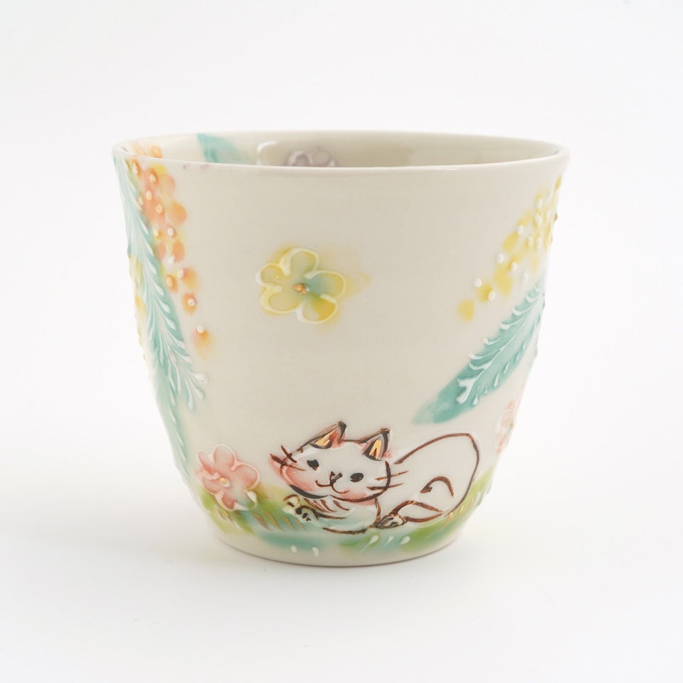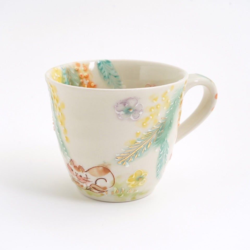 作品にはイッチンという技法が施され、可愛らしさがたっぷり詰まっています。淡く柔らかい色合いは、筆で色を重ね着彩することで生みだされています。