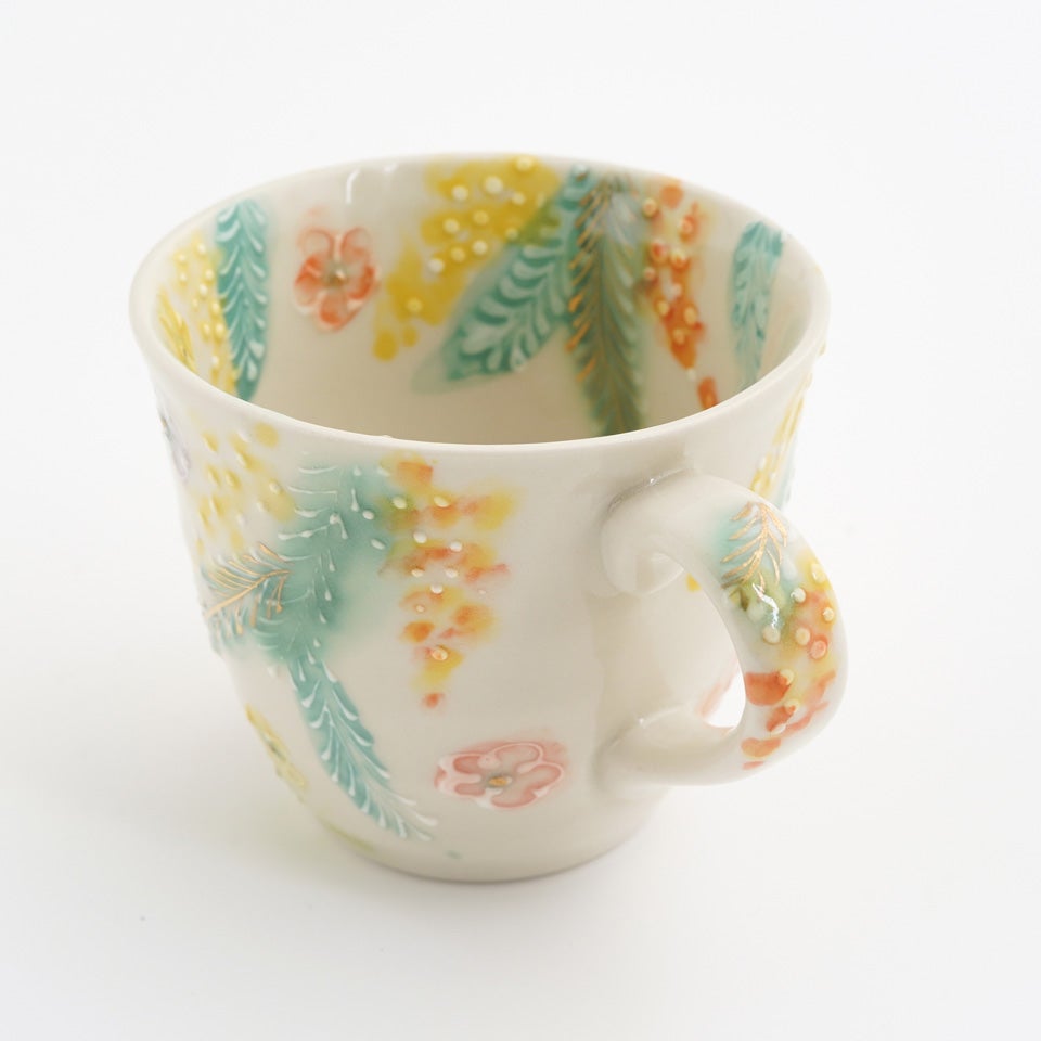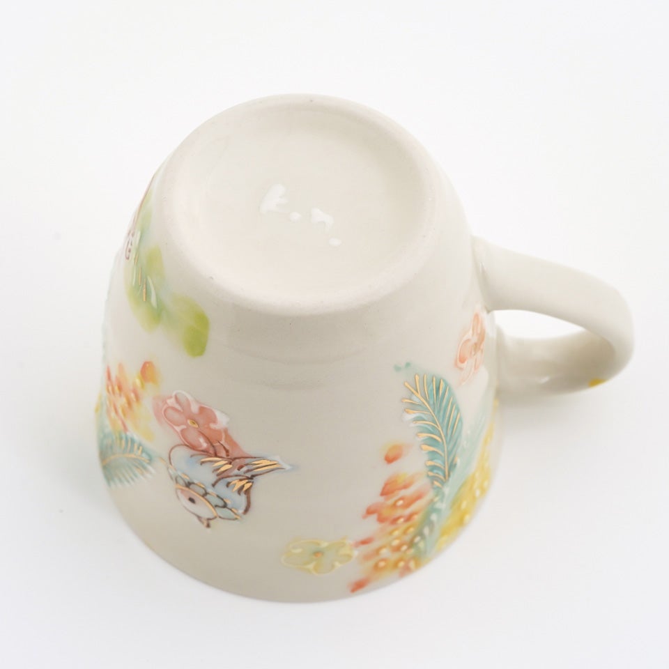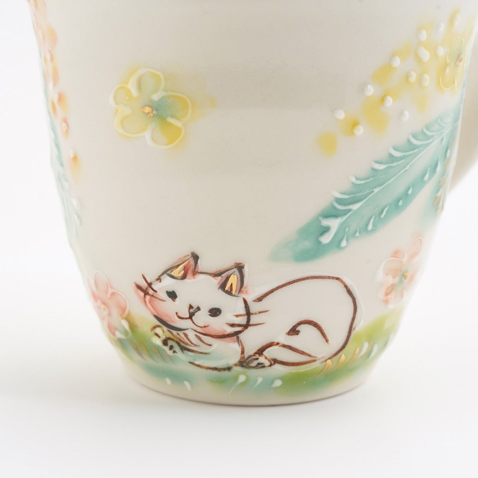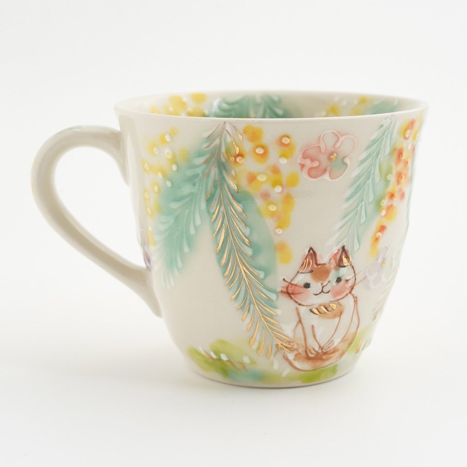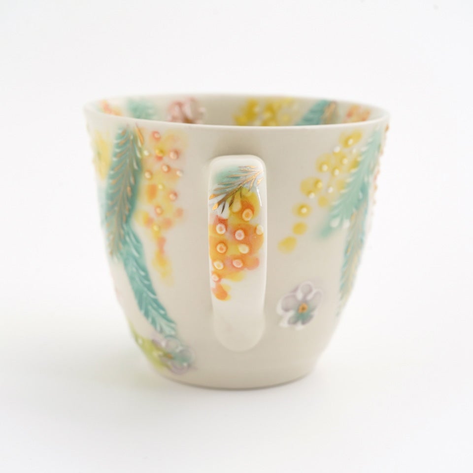 作品にはイッチンという技法が施され、可愛らしさがたっぷり詰まっています。淡く柔らかい色合いは、筆で色を重ね着彩することで生みだされています。