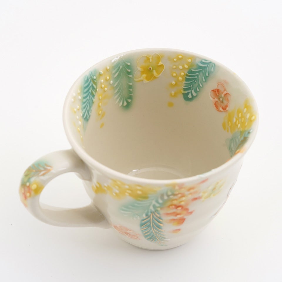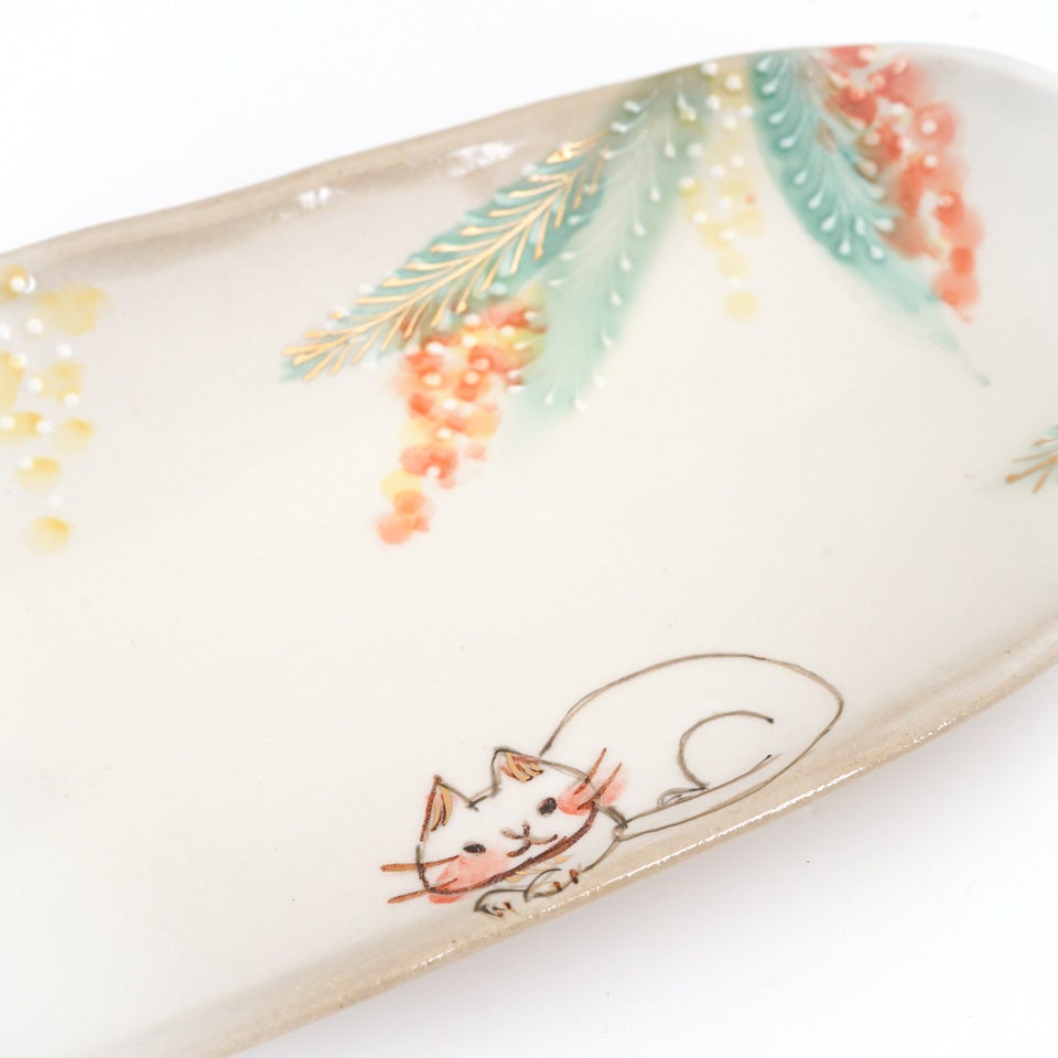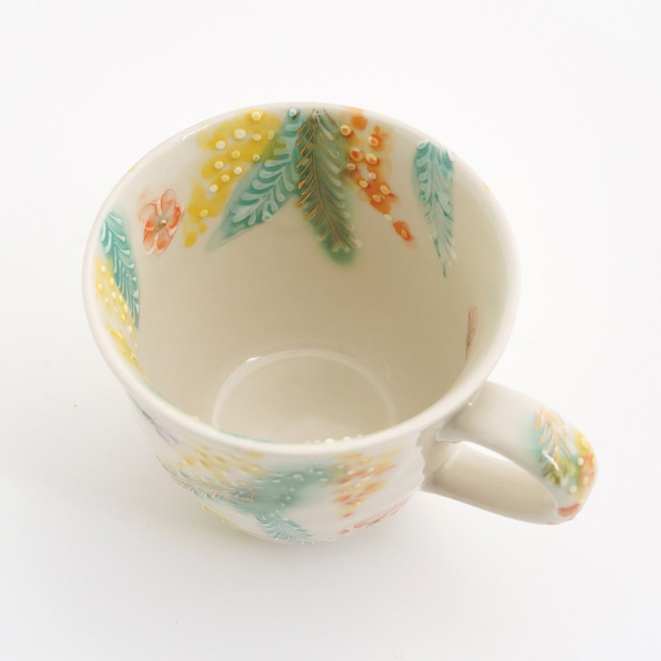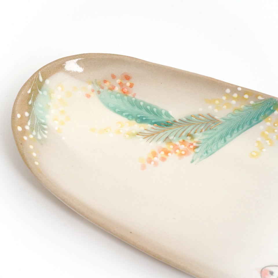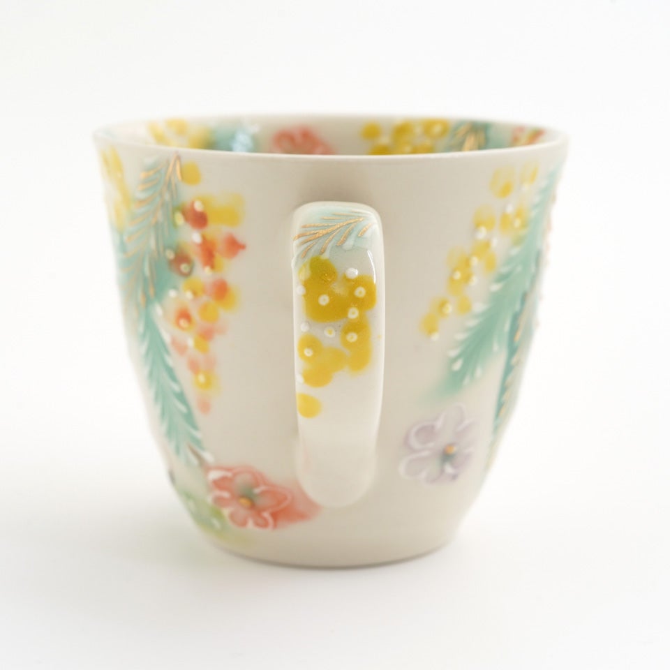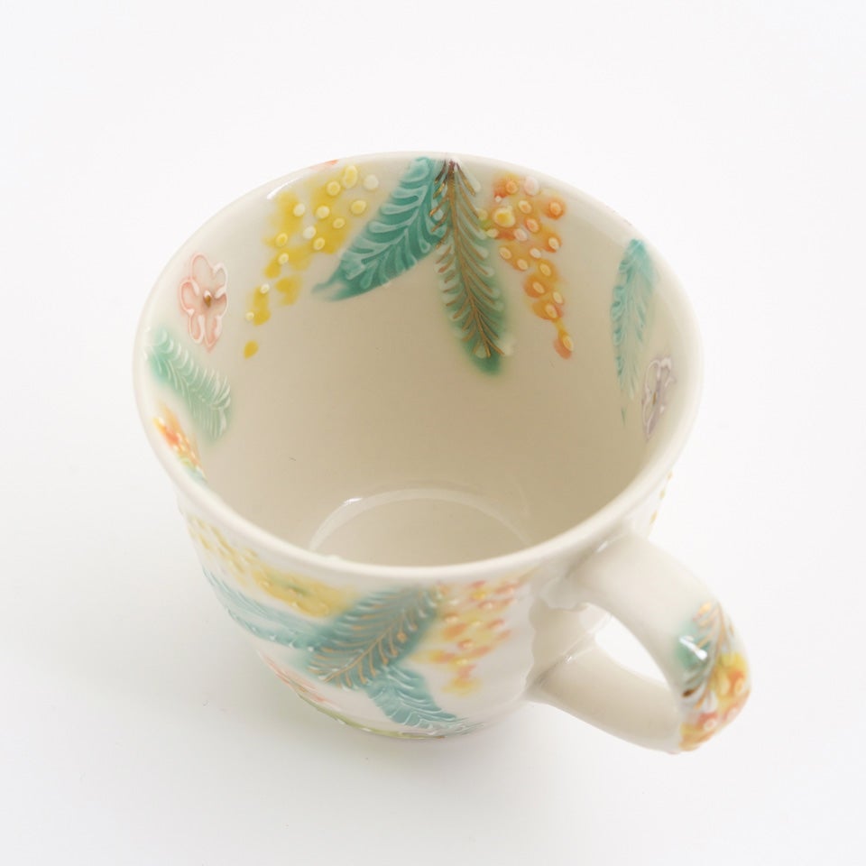 作品にはイッチンという技法が施され、可愛らしさがたっぷり詰まっています。淡く柔らかい色合いは、筆で色を重ね着彩することで生みだされています。