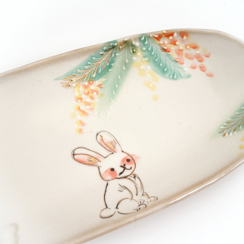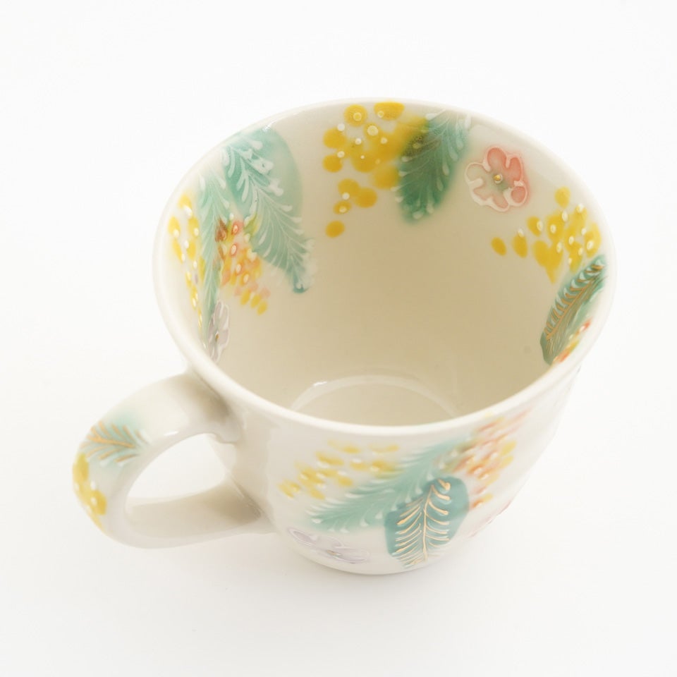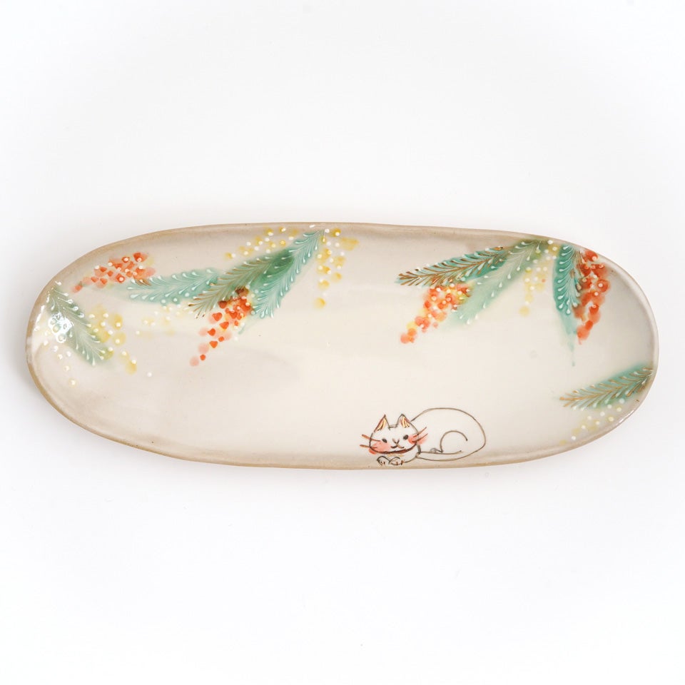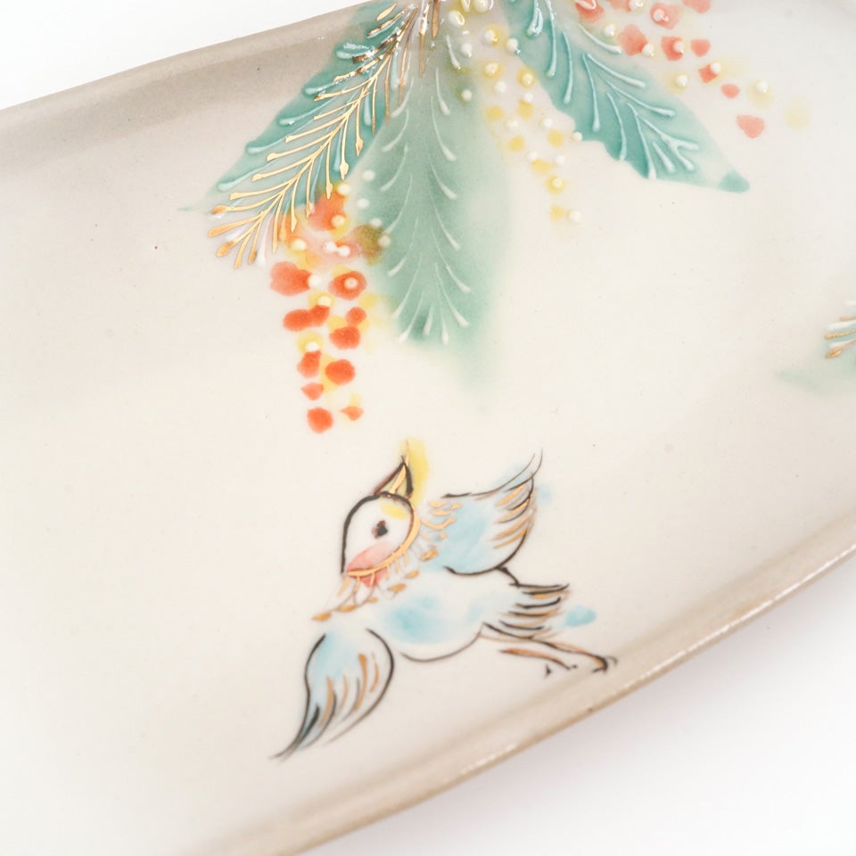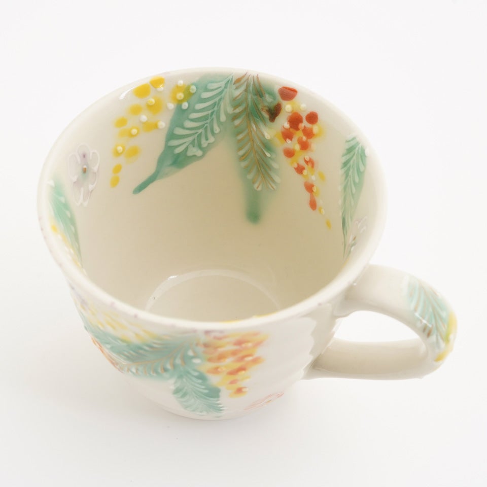 作品にはイッチンという技法が施され、可愛らしさがたっぷり詰まっています。淡く柔らかい色合いは、筆で色を重ね着彩することで生みだされています。