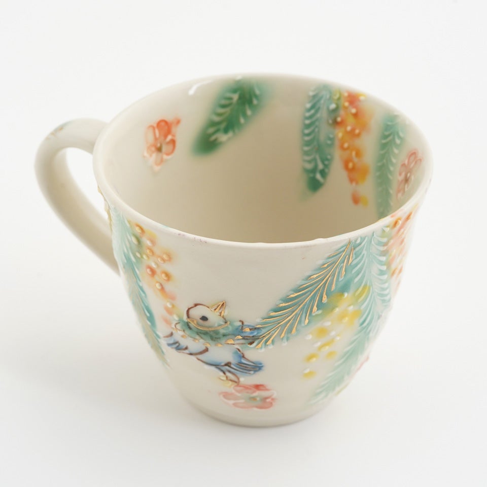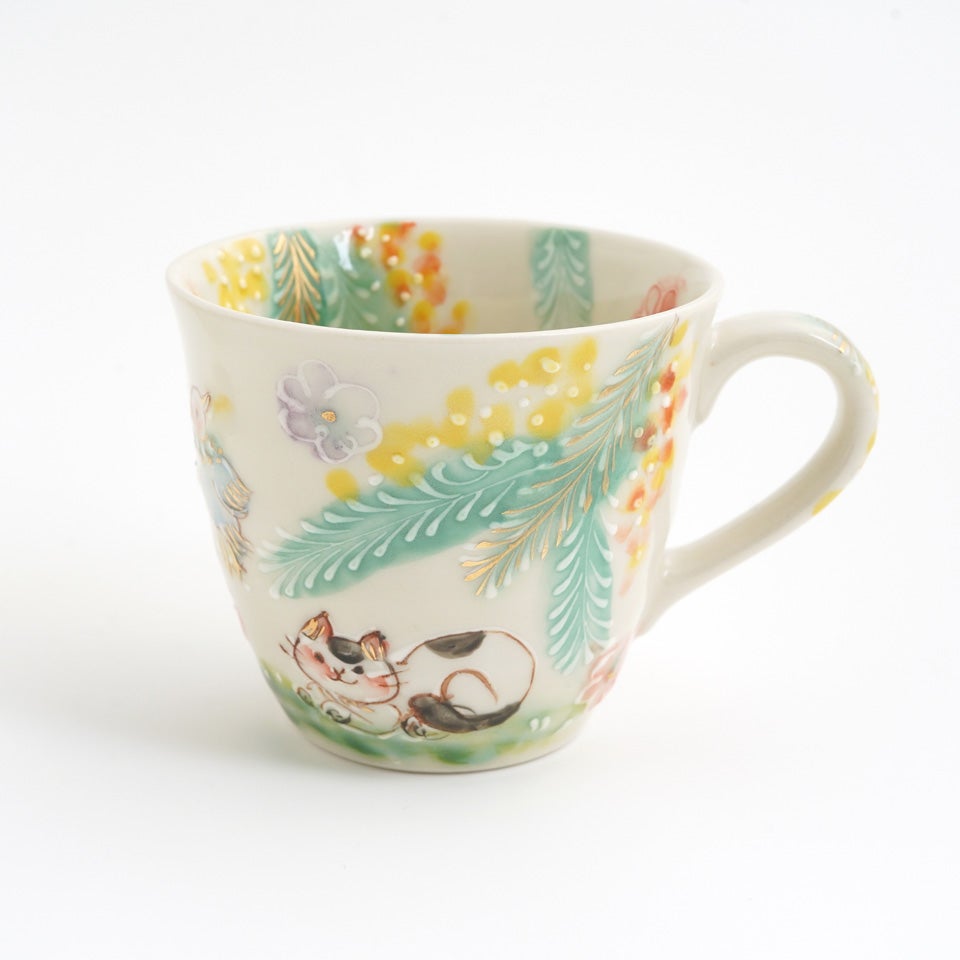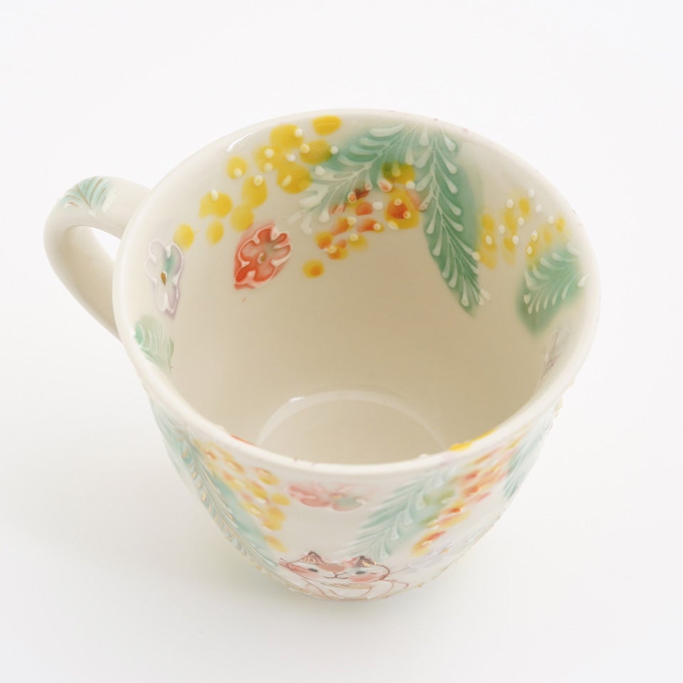 元々京都の窯元で絵付師をされていた内藤さんは、花や鳥の文様を描くことが多かったとのこと。ご自身が犬を飼われていることもあり、可愛らしい動物たちがあちらこちらからのぞいています。楽しい気持ちや癒しをお届けしたいという、内藤さんのお気持ちが伝わってくるようです。