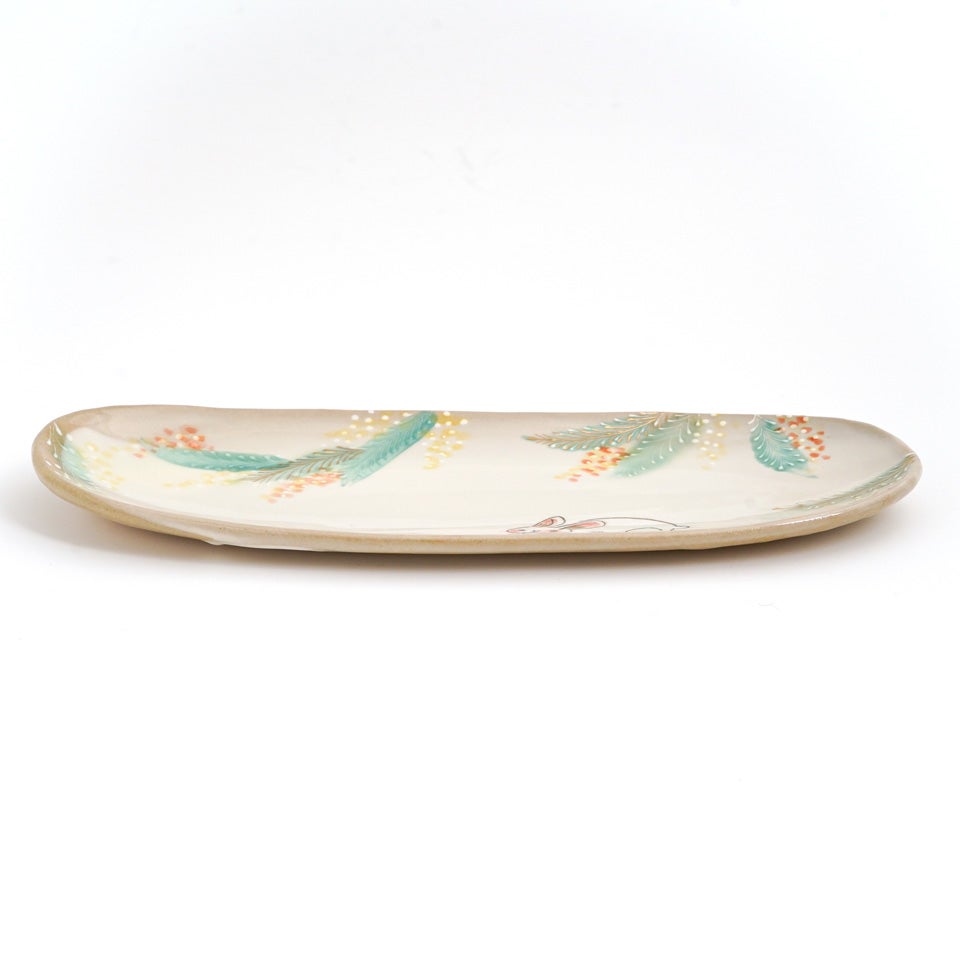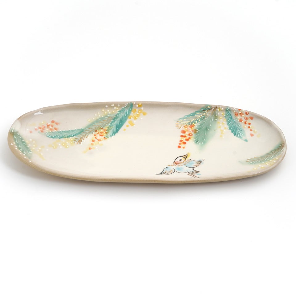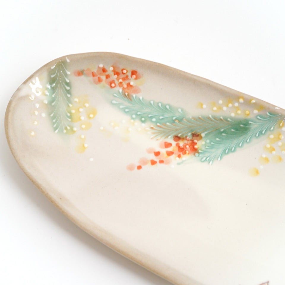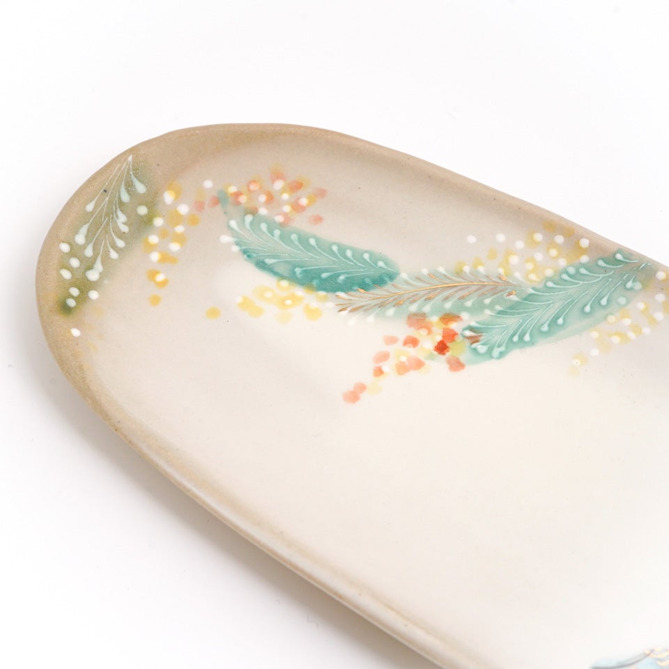 古くから日本人に愛されたその古典文様を、独特の渋さを持つ緑の織部釉とやや赤みがかった白の志野釉で塗り分け、京らしい季節の絵柄をちりばめた、職人の手仕事を感じさせる一皿です。
