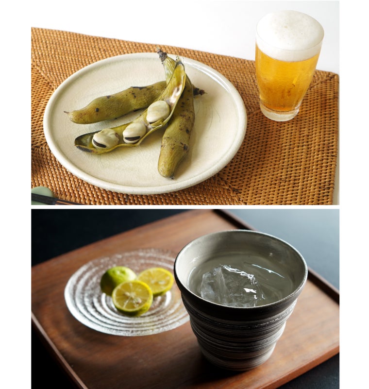 お酒の時間にも陶器とガラスの組み合わせを取り入れてみて。お皿か飲み物か、どちらかに陶器のうつわを使うとあたたかみが出るので、ガラスだけの食卓よりも、落ち着いた印象にすることができます。