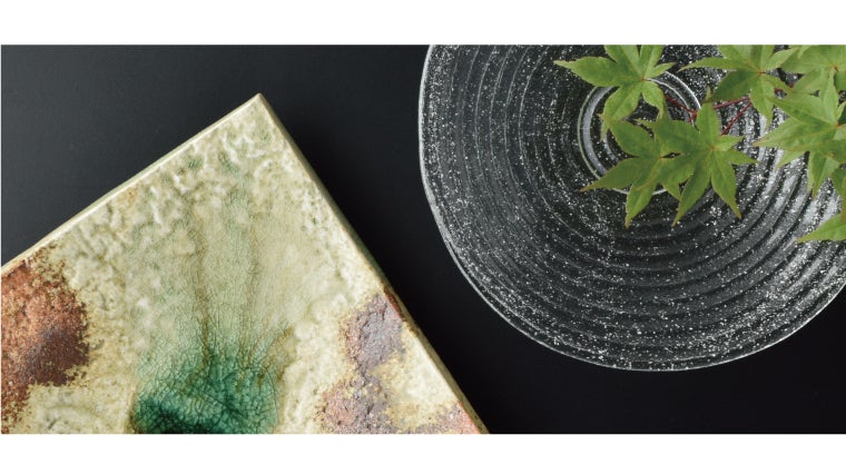 陶器とガラスは、食卓に並べると、その違いがより引き立ちます。その際は、あえて陶器らしい存在感を持つうつわを選びましょう。隣り合うことで、陶器の深みのある存在感が、またガラスの軽やかな透明感がより際立ち、対照的なもの同士が生み出すハーモニーを味わえます