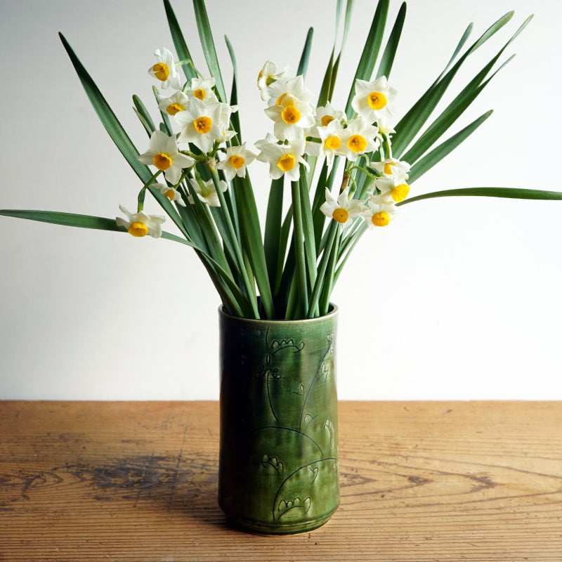 春の訪れを知らせる清楚な水仙とシンプルな織部唐草の花生。織部の花生は、口の大きさを変えられるので、一輪挿しから、ダイナミックに広く生けたり、同じ花や植物でも印象を変えてくれます。かわいらしい印象ですが、寒さに負けず花を咲かせることができる強さを持つ水仙。自分を大切にという意味合いをもつ水仙は、丁寧に自分と向き合いたい方に、ぜひそばにおいてほしい花です。
