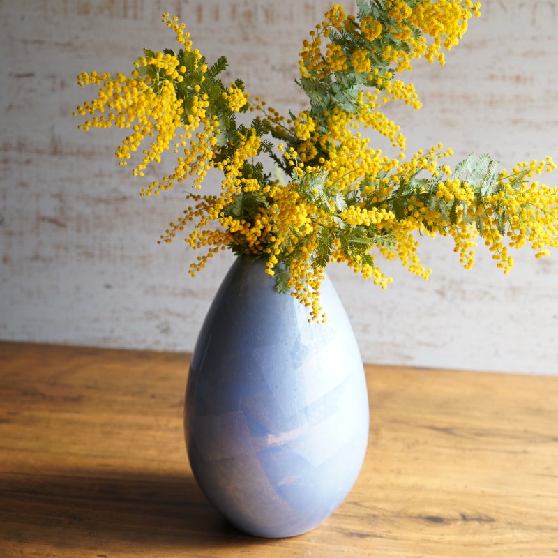 厳しい寒さの冬が終わり、穏やかな春の訪れを告げてくれる明るい表情のミモザ。清秀 花生は銀箔の重なり具合で色の雰囲気に違いが生まれ、鮮やかな色合いの花をさわやかに演出してくれます。銀箔がほどよく光を取り込むので、花生の色が主張しすぎずに花を主役に引き立ててくれます。ミモザの日である3月8日には、感謝や敬意を込めて男性から女性にミモザを贈る風習もあるそう。大切な方にミモザと花生を贈れば、さらに相手を想う気持ちが伝わりそうです。