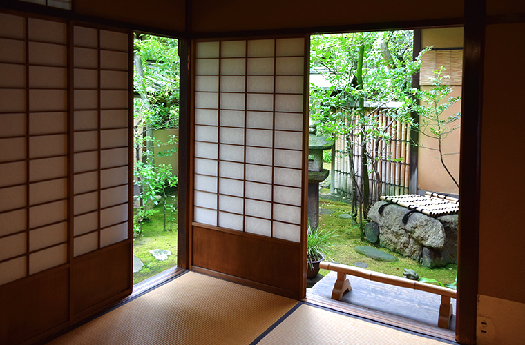 障子、襖を夏建具へ変える建具替え。杉本家では梅雨の収まる7月ごろに行われます。庭に萌える緑が障子を染める様子は、この時期ならではの風情です。