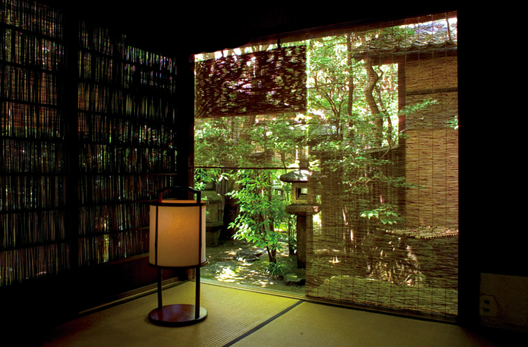 簀戸(すど)と簾(すだれ)は、強い陽射しを和らげ風を招く夏の建具。飴色の建具が作る翳りに身を置けば、まるで木陰に憩うかのようです。