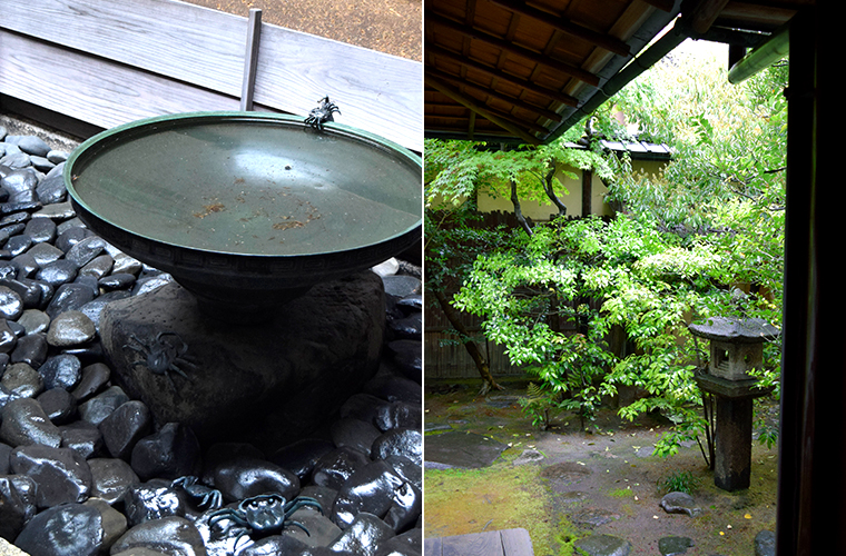 細かな五月雨に濡れる庭の若葉。運ばれる風に濃い新緑の香りを感じます。仏間庭では、滑石が黒くしっとりとした光を湛えます。唐銅水盤に滴る水音、海を模して据えられた蟹の置物が涼やかな水辺を思わせます。