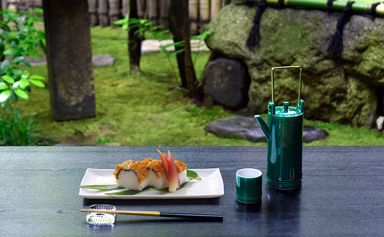 鱧は梅雨の雨を飲んで美味しくなると言われていました。梅雨明けの7月頃より旬を迎えますが、京ではちょうど祇園祭のころ。京いちばんのハレの行事に欠かせない旬の味として愛されています。夏の旬味は、涼やかなうつわで迎えたいもの。夏日に身を晒してみたとき、目に心地よい色かたちを選べば、自ずと食卓は涼を求める雰囲気にまとまります。雨上がりの緑濃い庭を眺めながら一献。まもなく訪れる華やかな宵を待ちます。