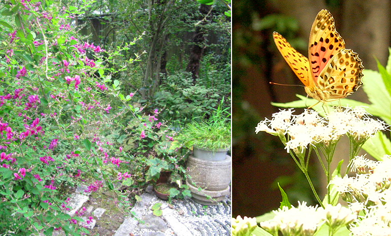 前庭に咲き乱れる萩と、フジバカマに羽を休めるツマグロヒョウモン。
