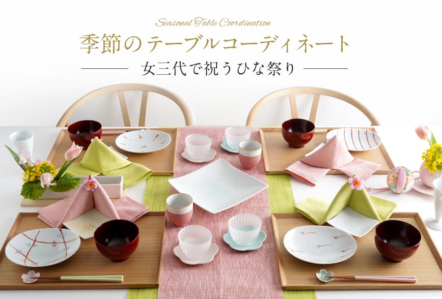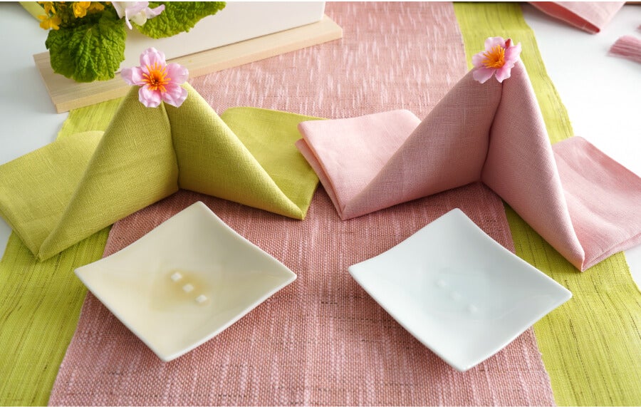 テーブルナプキンの折り方でひな人形に。角皿を置く角度で、菱形(菱餅)に。その行事専用のアイテムでなくとも、見立てで十分にひな祭りを演出できます。