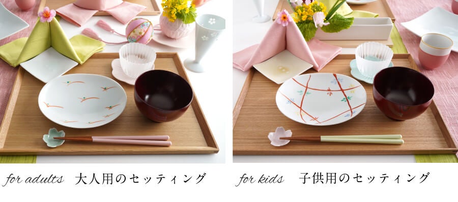 色を変えて、2パターンの組み合わせを用意しました。大人用にはゴブレットで白酒、子供用にはお湯呑で甘酒を。テーブルランナーとリンクする桃色×蓬色の菱餅カラーを交互に重ねて、テーブル全体をまとめます。