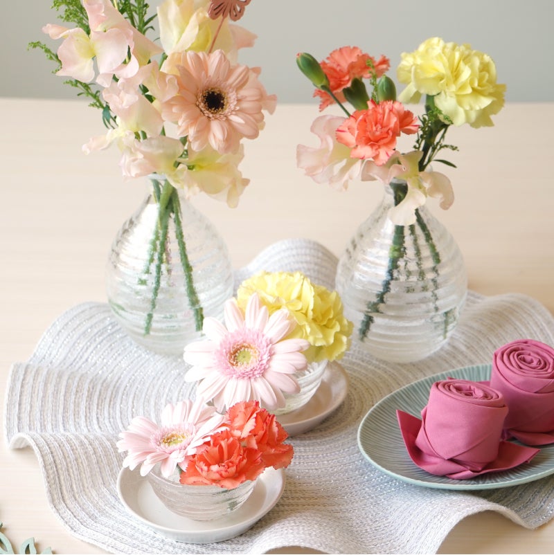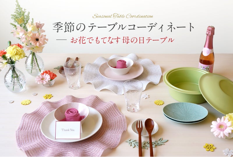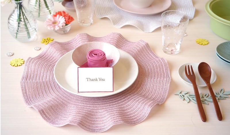今年は母の日に、テーブルコーディネートにチャレンジしてみてはいかがでしょうか。難しい料理はできなくても、おもてなしの気持ちでお母さんを喜ばせましょう。ワンプレートを基本に同じシリーズを重ねると、組み合わせに悩まず簡単にコーディネートが完成します。フラワーガーデンをテーマに、ランチョンマットやテーブルナプキンなどを使ってお花のモチーフを散りばめたら、お母さんも心ときめく女性らしく可愛いテーブルのできあがりです。