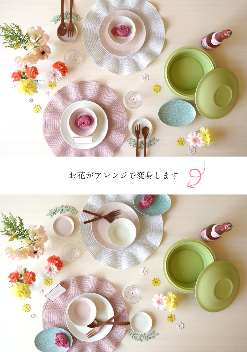 ワンプレートを重ねた姿は、上から見るとお花のようでキュート。食事中のスタイルは、取り皿を手元にセッティングしてみましょう。グリーンのお皿がまるで葉っぱのようで、また違ったお花の表情が見えてきます。