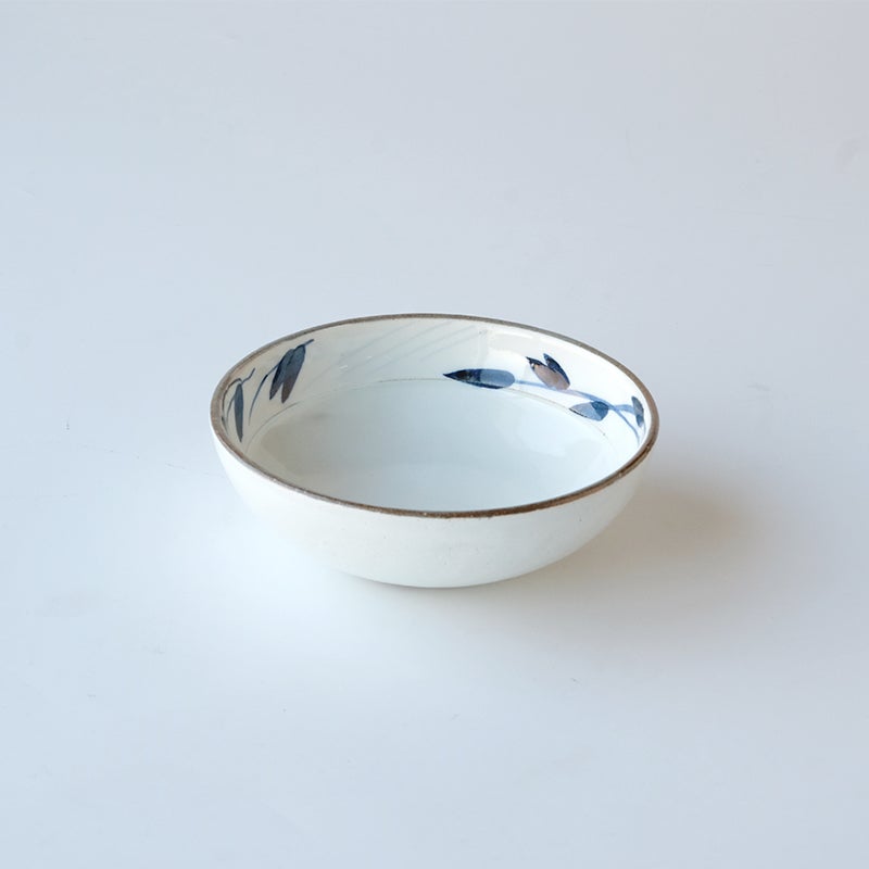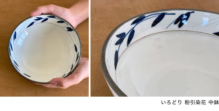 陶器は重いと思われがちですが、中鉢は約230gとマグカップと同じくらいの軽さなのです。スッキリとした染花が特に和・洋とかたよらないせいか、料理のジャンルを選びません。また染花の下にある一筋の切り返しが、のっぺりとなりがちな白色をキリリと引き締めてくれています。スープはこのラインまでと目安にするとバランスが良く、またなんでもないお惣菜には、アクセントになってくれたり。小さなことですが、一つひとつが効いている、と感じるデザインです。