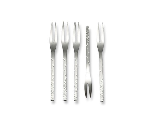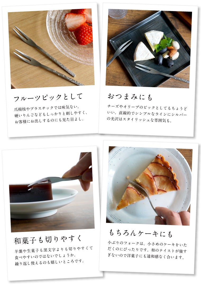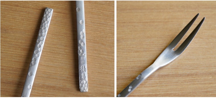 鹿の子供の背中の模様というなんだか可愛らしい鹿の子文様が、表だけでなく裏にも打ち込まれた持ち手は、見た目の良さだけでなく凹凸が手に馴染み持ちやすくなっています。 フォークの間隔が狭いと間にものが詰まることがあるのですが、2本の平たいフォーク形は洗いやすく、ステンレス素材なので変色したりすることもありません。