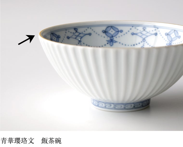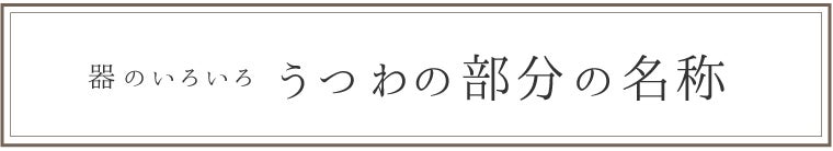口造り(くちづくり)や口辺り(くちべり)、口縁(こうえん)、と言います。うつわの雰囲気や口当たりを左右する重要な部分で、内側や外側に反ったもの・厚みのあるものなどがあります。薄いと口当たりがよい反面欠けやすいため、大切に扱いましょう。