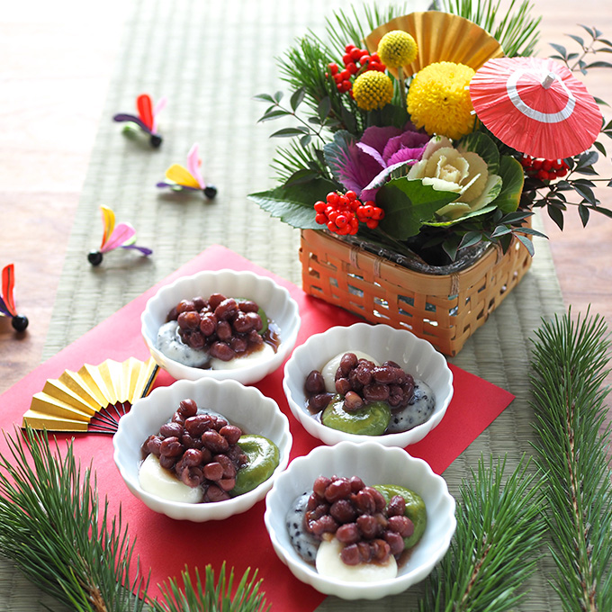 - ❹ ❸の水気を切ったら、あずきをトッピングして完成です。