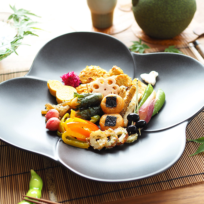 - ❷ ❶を10gずつ丸く成型したら、海苔や大葉を巻きつけて爪楊枝に刺して低温で揚げ、浮いてきたら完成です。