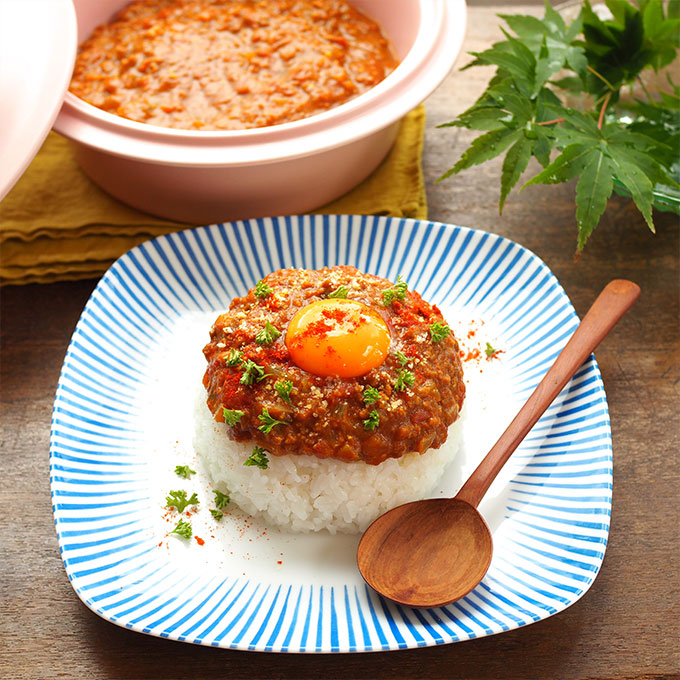 - ❶ らくらくスチーマーにBを入れてよく混ぜ合わせたら、Aも加え混ぜて蓋をし、600Wの電子レンジに入れて約10分加熱する。全体をよく混ぜて完成です。器にごはんを盛り、お好みでCを添えてどうぞ。
