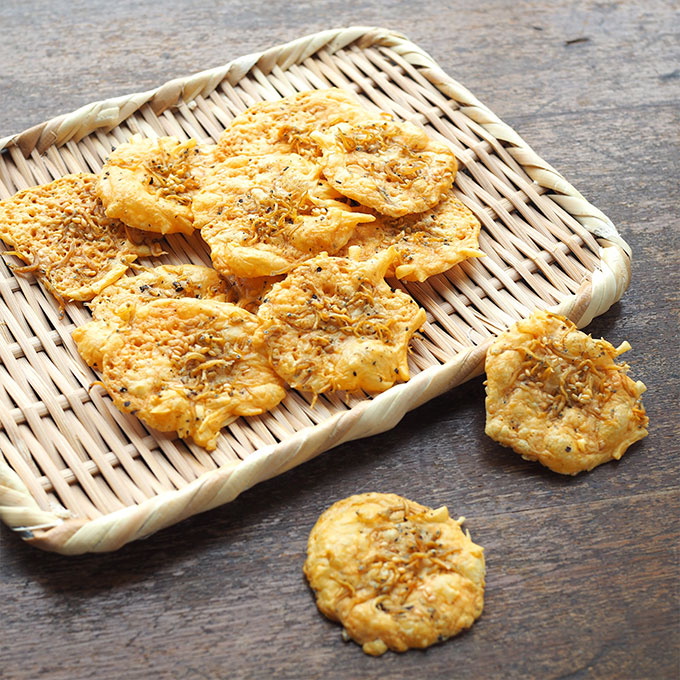76_じゃこチーズせんべい 2023.04.14 じゃこチーズせんべい 材料 (直径 約5cm/12枚分) シュレッドチーズ…… 60g ちりめんじゃこ…… 10g 白炒りごま…… 2g 黒こしょう…… 適量 作り方 ❶ (オーブンを200度に予熱する)天板にオーブンシートを敷き、チーズを12等分して(5gづつ)並べ、Aを等分にトッピングしたら、200度のオーブンで約15分焼く。おやつ・おつまみ・サラダのトッピング等にどうぞ。 ※シュレッドチーズは、とろけるタイプなどお好みのものでOKです。 « 前のレシピへ レシピ一覧 次のレシピへ »