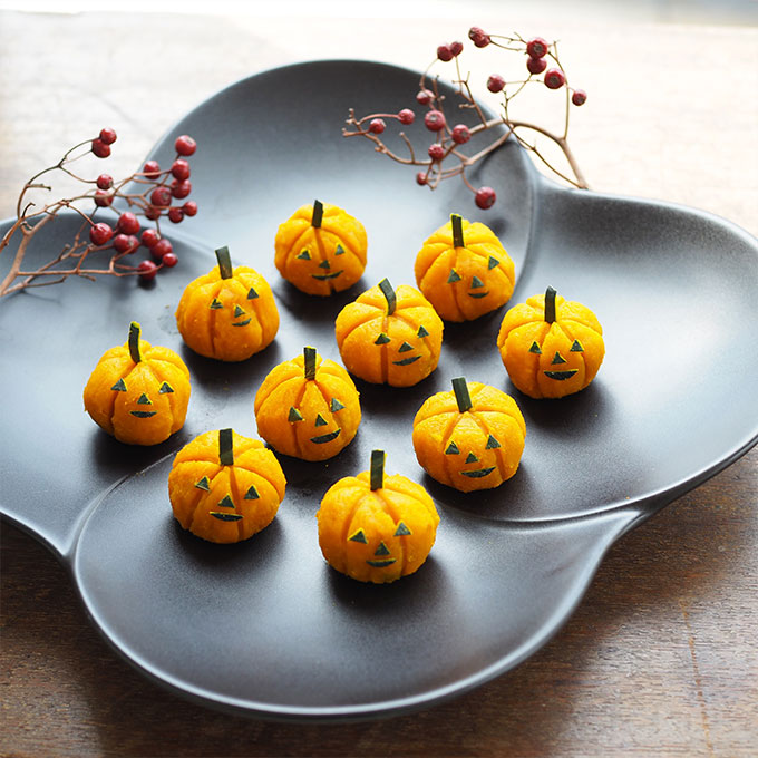 - ❸ ❷を10等分にしてラップで丸め、フォークなどで縦に筋をつける。取り分けておいた皮は、小さな棒状にカットし(かぼちゃのヘタになる部分)、目と鼻と口になる部分もそれぞれカットし、顔に見立ててくっつけて完成です。